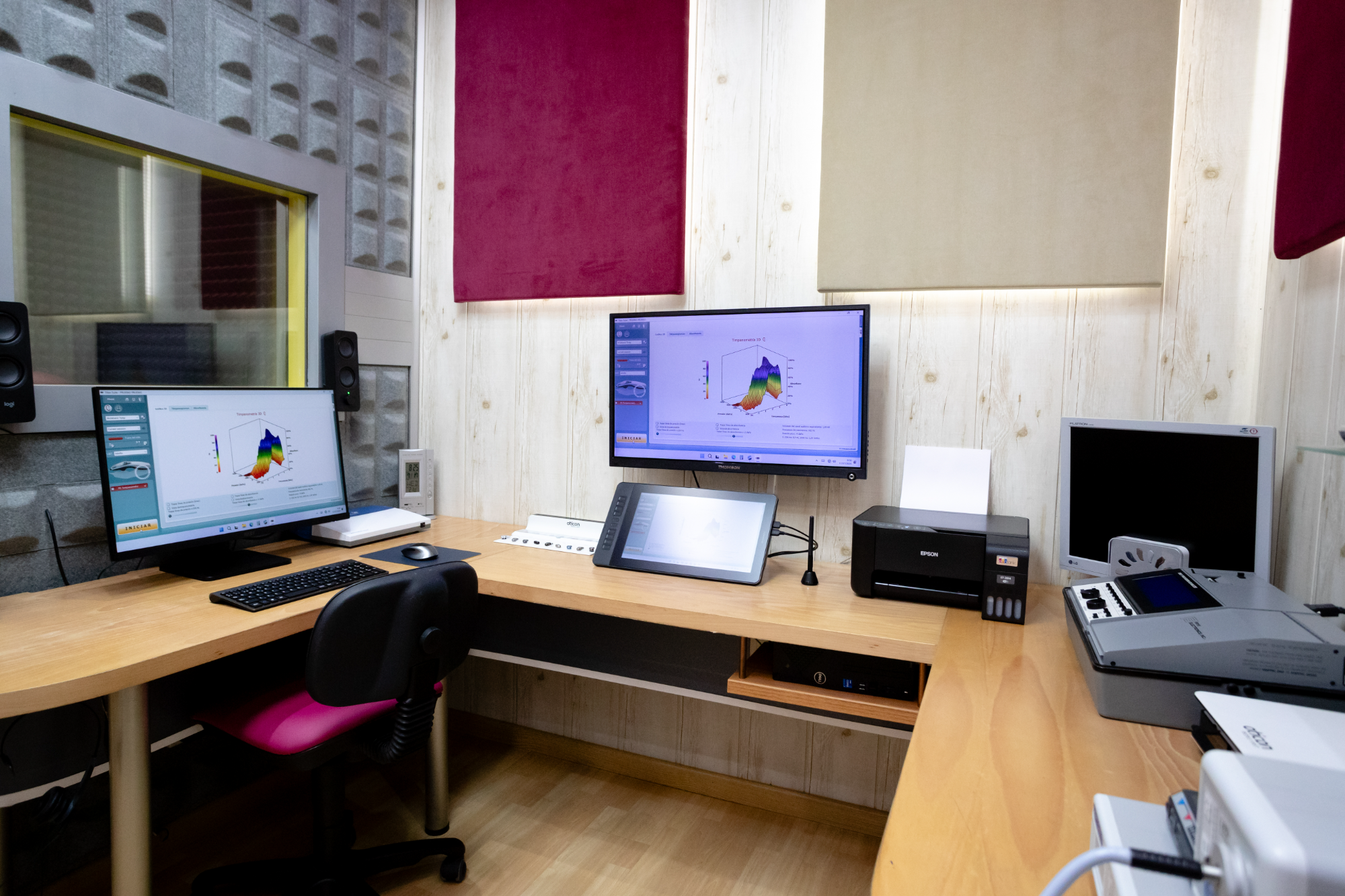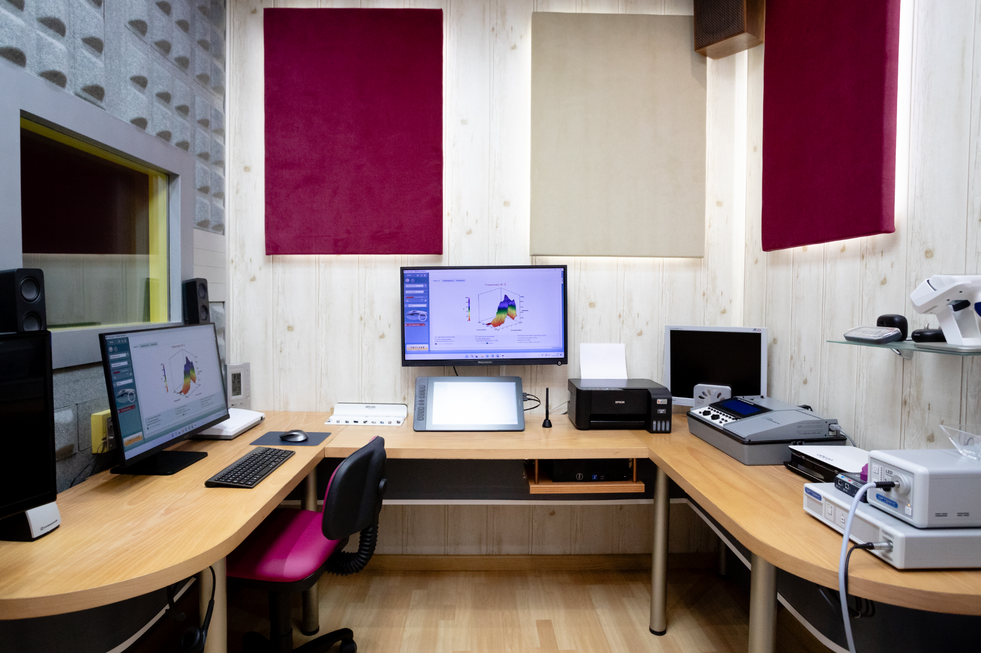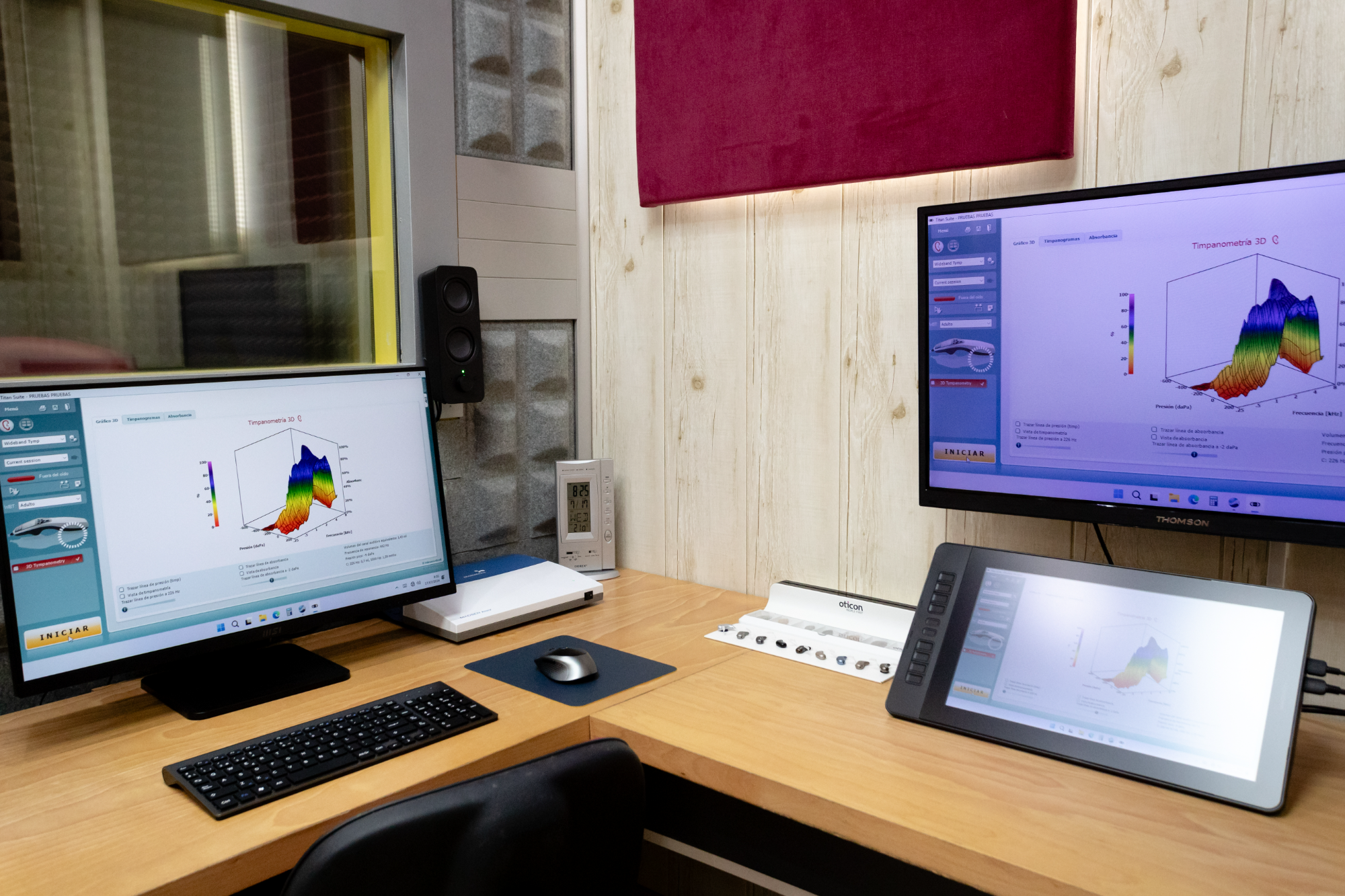 Dos cabinas audiométricas anecoicas con audiómetro integrado dentro de la plataforma de programación NOAH4, usada para realizar las siguientes pruebas: